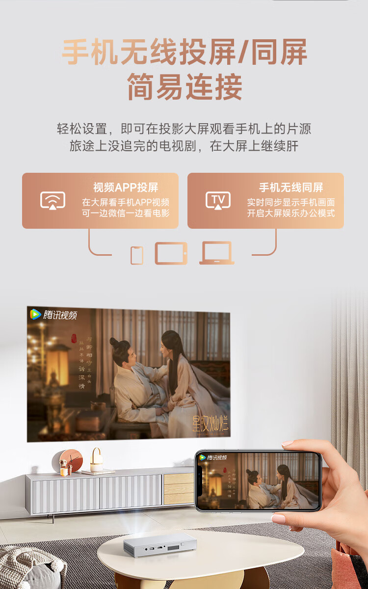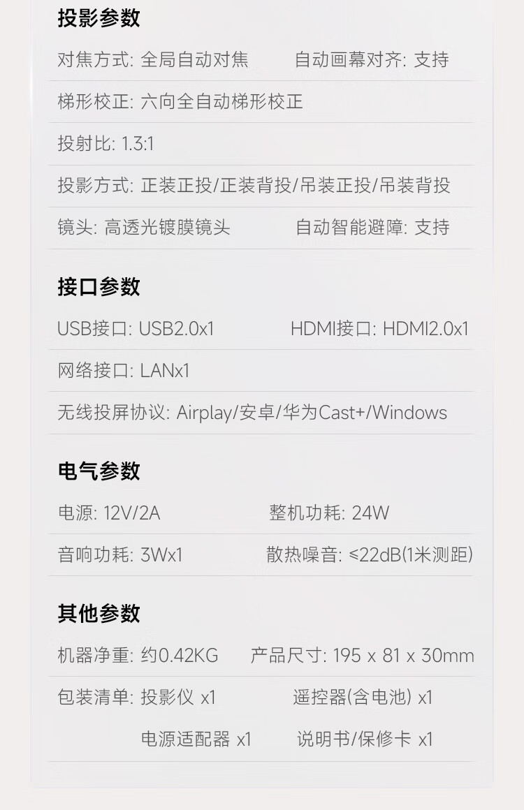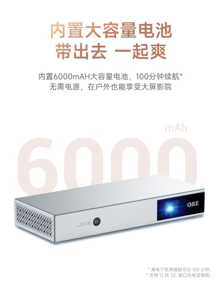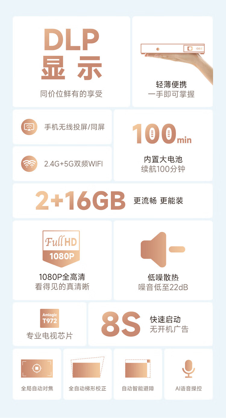 内置电池 | 轻薄便携 | 自动对焦 | 自动梯形校正 |分辨率:1920*1080dpi | 亮度:250流明