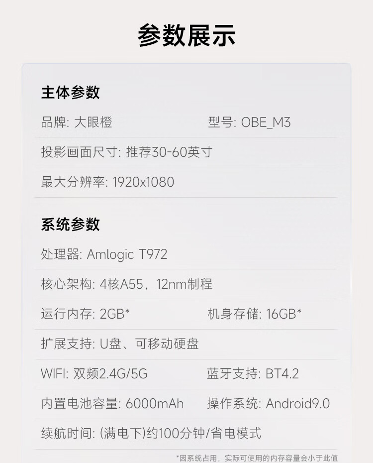 商品名称:大眼橙 M3 投影仪家用 便携户外 露营影院投影机